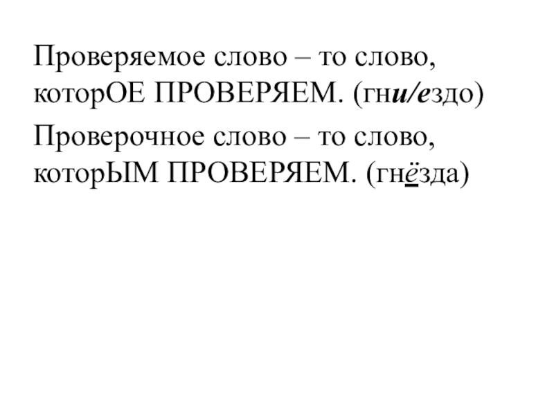 Слайд 3Проверяемое слово – то слово, которОЕ ПРОВЕРЯЕМ. (гни/ездо)