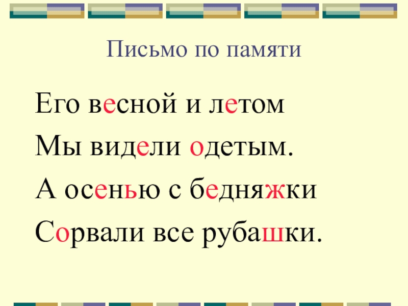 Письмо по памятиЕго весной и летом Мы видели одетым.А осенью с бедняжки Сорвали все рубашки.