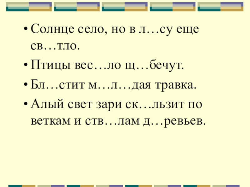 Солнце село, но в л…су еще св…тло.Птицы вес…ло щ…бечут.Бл…стит м…л…дая травка.Алый свет зари ск…льзит по веткам и