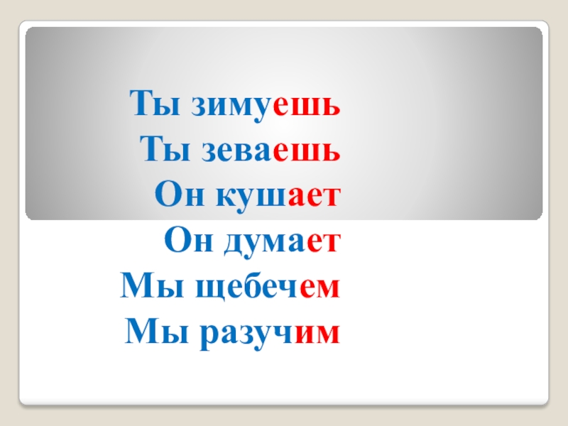 Ты зимуешьТы зеваешьОн кушаетОн думаетМы щебечемМы разучим
