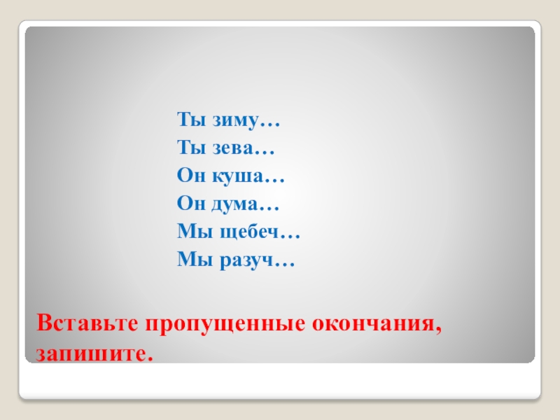 Вставьте пропущенные окончания, запишите.Ты зиму…Ты зева…Он куша…Он дума…Мы щебеч… Мы разуч…
