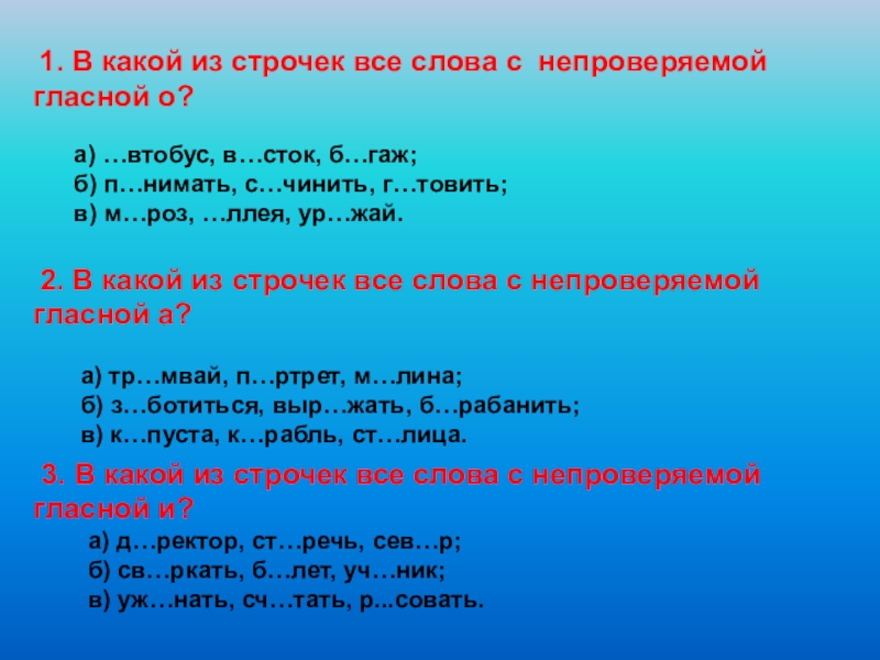 3. В какой из строчек все слова с непроверяемой гласной и?