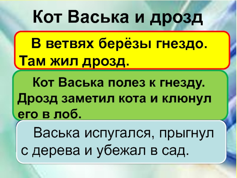 Кот Васька полез к гнезду. Дрозд заметил кота и клюнул его в лоб.