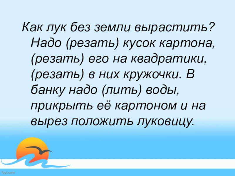 Слайд 6Как лук без земли вырастить? Надо (резать) кусок картона, (резать) его