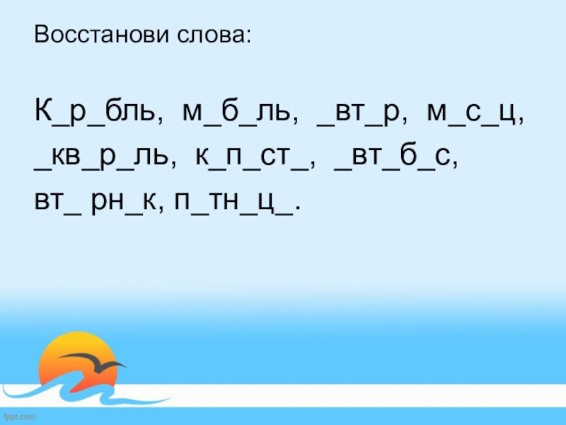 Восстанови слова:К_р_бль, м_б_ль, _вт_р, м_с_ц, _кв_р_ль, к_п_ст_, _вт_б_с, вт_ рн_к, п_тн_ц_.