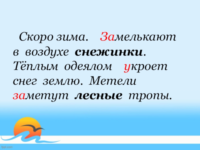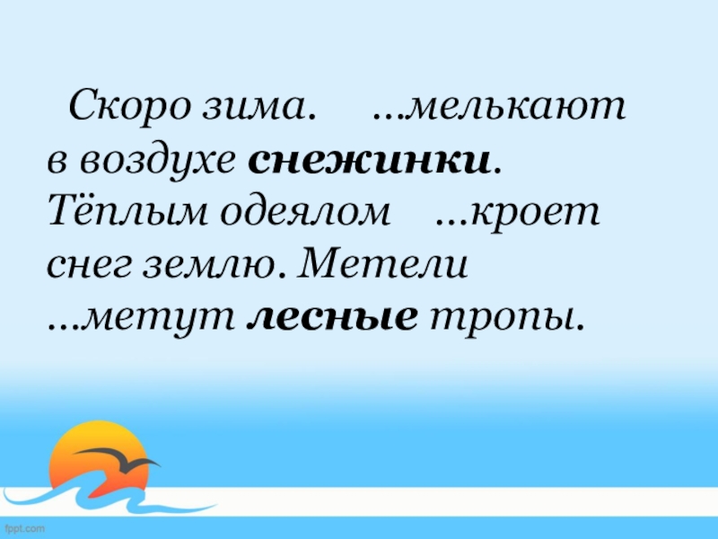 Слайд 5 Скоро зима. Замелькают в воздухе снежинки. Тёплым одеялом