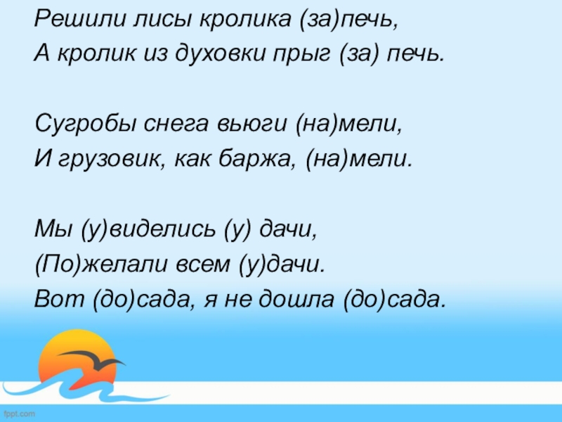 Решили лисы кролика (за)печь,А кролик из духовки прыг (за) печь.  Сугробы снега вьюги (на)мели,И грузовик, как баржа,