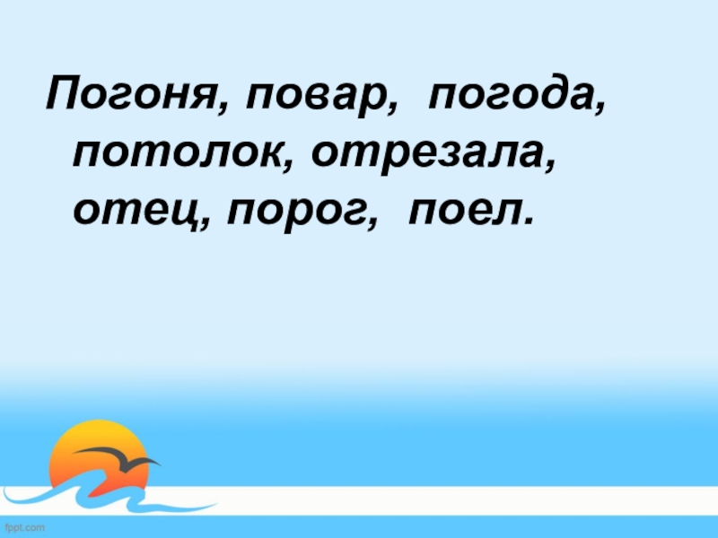 Слайд 7Погоня, повар, погода, потолок, отрезала, отец, порог, поел.