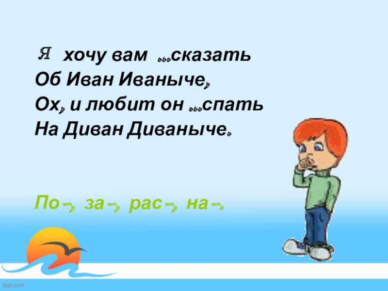 Я хочу вам …сказатьОб Иван Иваныче,Ох, и любит он …спатьНа Диван Диваныче.По-, за-, рас-, на-.
