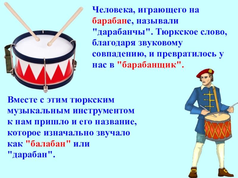 Человека, играющего на барабане, называли "дарабанчы". Тюркское слово, благодаря звуковому совпадению, и превратилось у нас в "барабанщик".