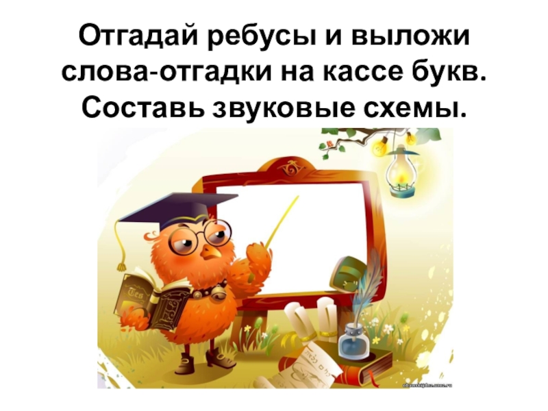 Слайд 2Отгадай ребусы и выложи слова-отгадки на кассе букв. Составь звуковые схемы.