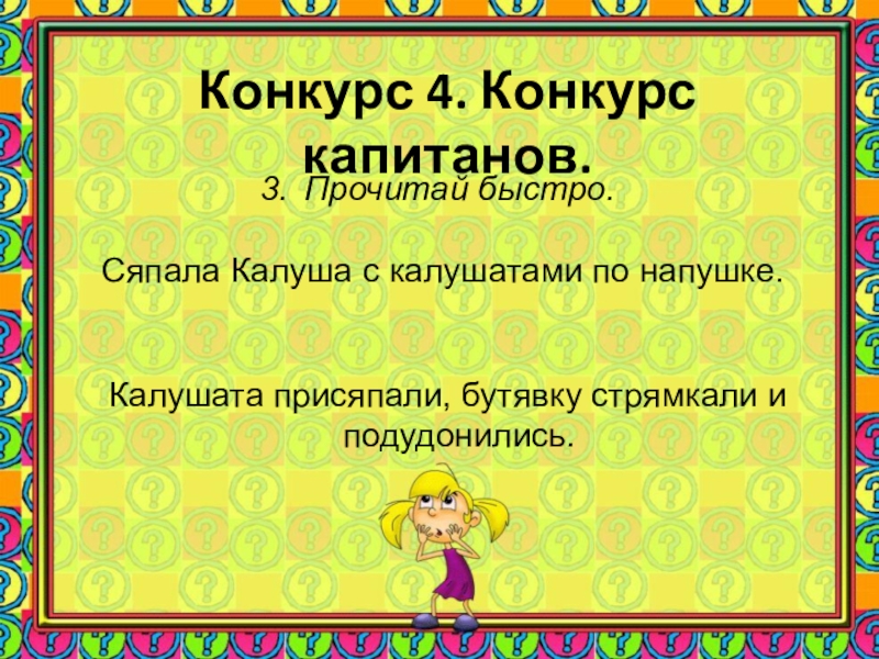 Конкурс 4. Конкурс капитанов.Прочитай быстро.Сяпала Калуша с калушатами по напушке. Калушата присяпали, бутявку стрямкали и подудонились.