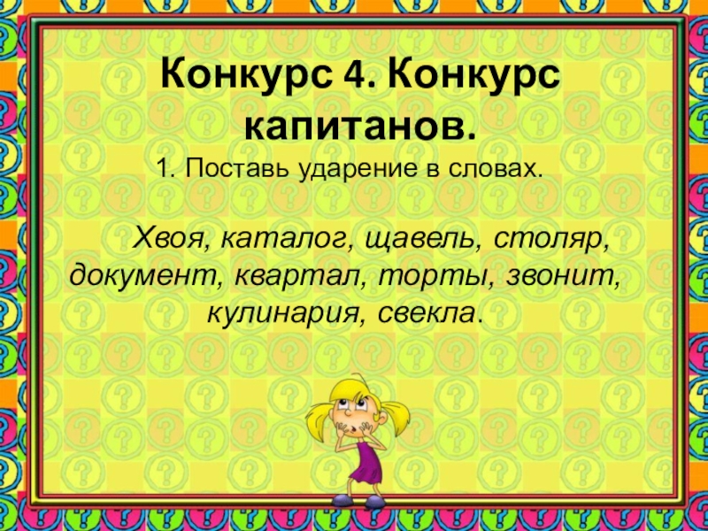 Конкурс 4. Конкурс капитанов. 1. Поставь ударение в словах.    Хвоя, каталог, щавель, столяр, документ,