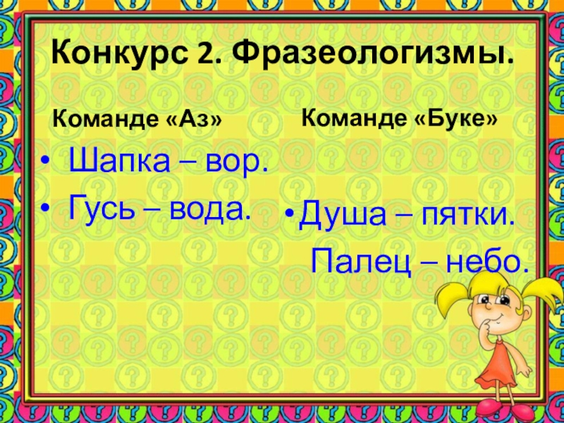 Конкурс 2. Фразеологизмы.Команде «Аз»Шапка – вор.Гусь – вода. Команде «Буке»Душа – пятки.   Палец – небо.