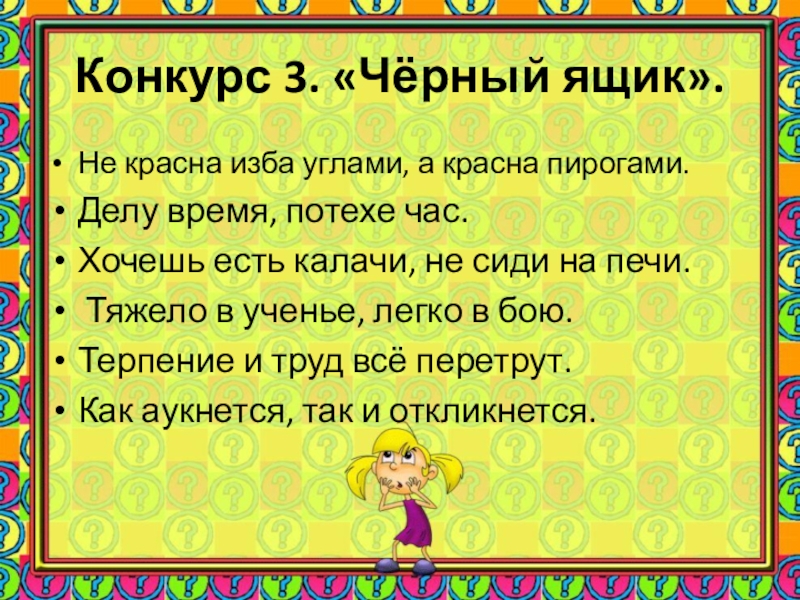 Конкурс 3. «Чёрный ящик».Не красна изба углами, а красна пирогами.Делу время, потехе час.Хочешь есть калачи, не сиди