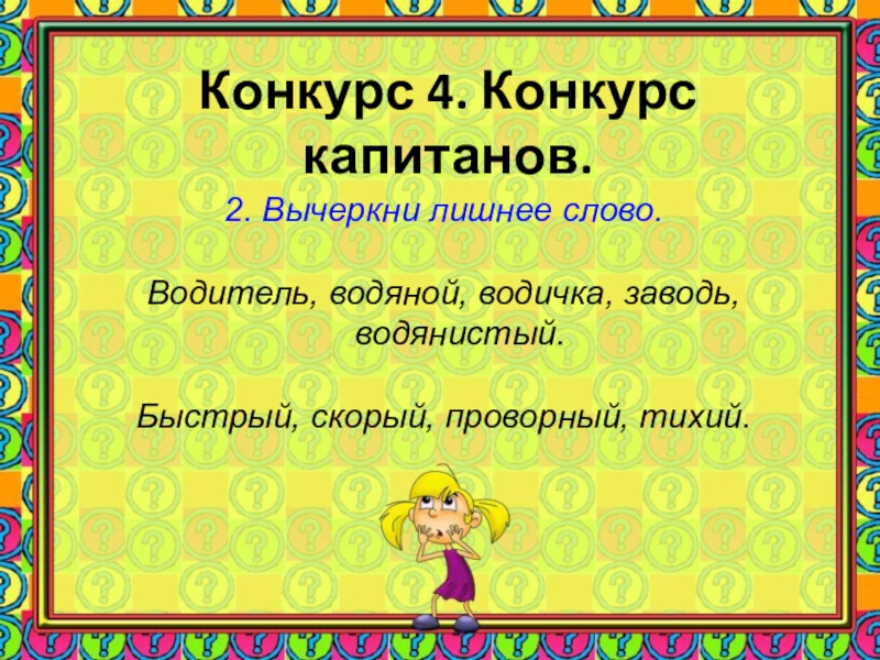 Конкурс 4. Конкурс капитанов.2. Вычеркни лишнее слово.Водитель, водяной, водичка, заводь, водянистый.Быстрый, скорый, проворный, тихий.