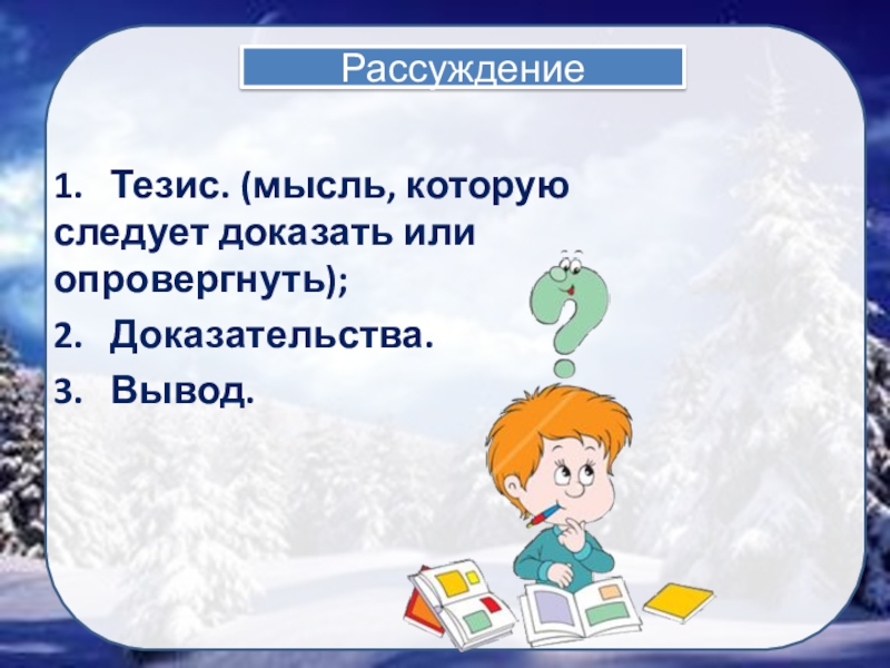 Рассуждение - основывается на разъяснении и утверждении какой-либо мысли, описывает причины явлений, размышления.