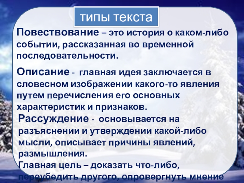 Описание - главная идея заключается в словесном изображении какого-то явления путем перечисления его основных характеристик и признаков.