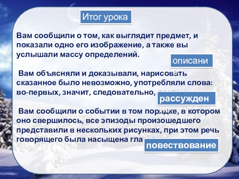 Вывод: повествовательный текст может содержать элементы описания и рассуждения.