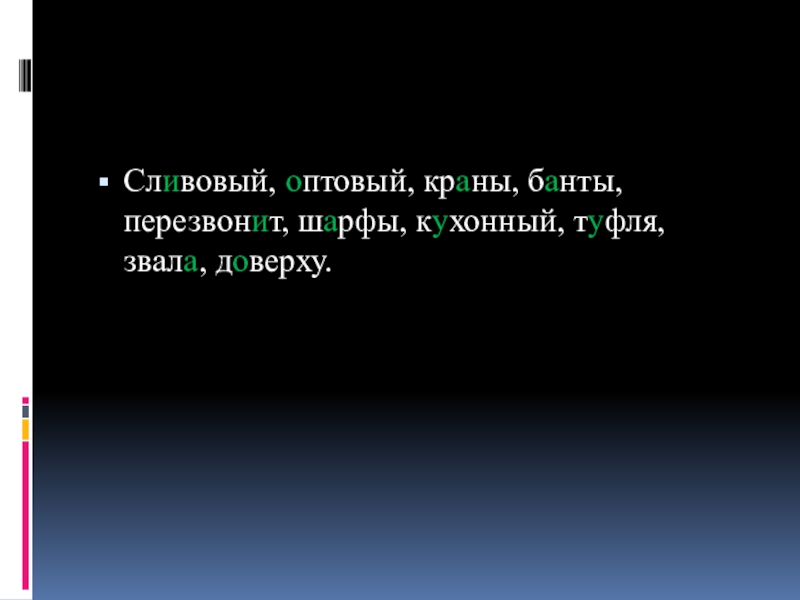 Слайд 15Сливовый, оптовый, краны, банты, перезвонит, шарфы, кухонный, туфля, звала, доверху.