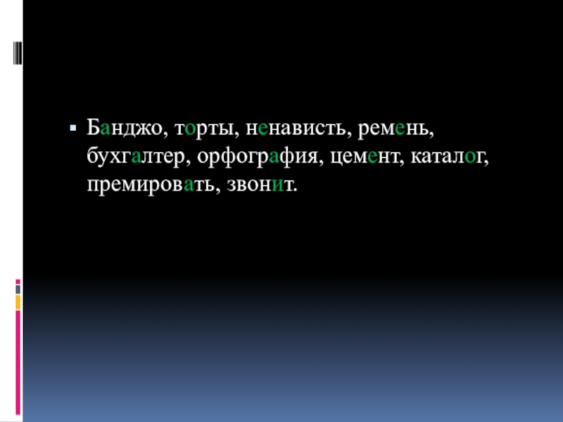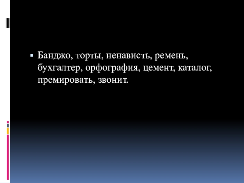 Слайд 12Банджо, торты, ненависть, ремень, бухгалтер, орфография, цемент, каталог, премировать, звонит.