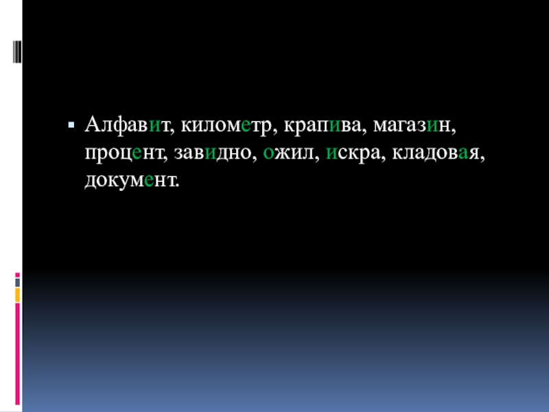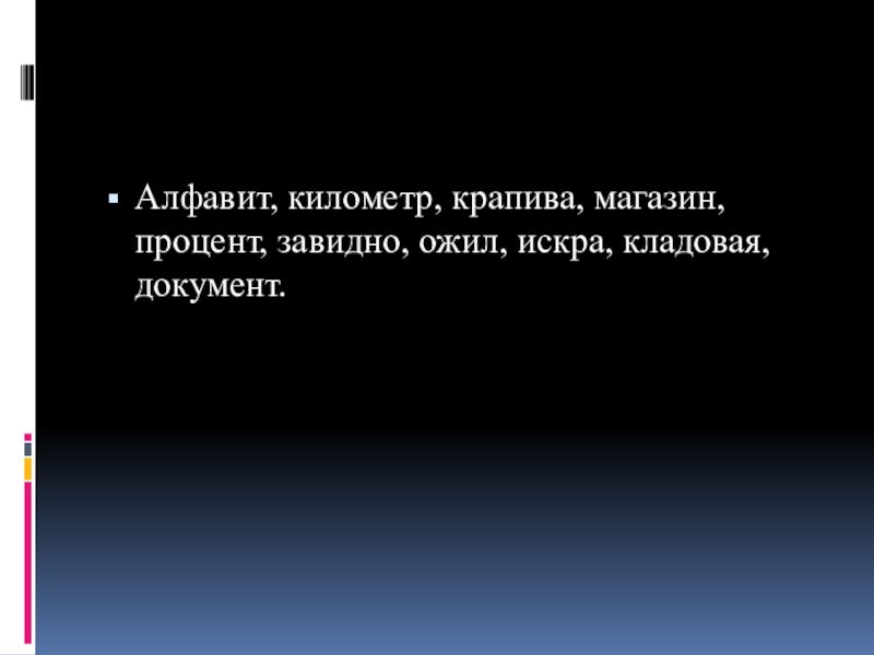Слайд 11Алфавит, километр, крапива, магазин, процент, завидно, ожил, искра, кладовая, документ.