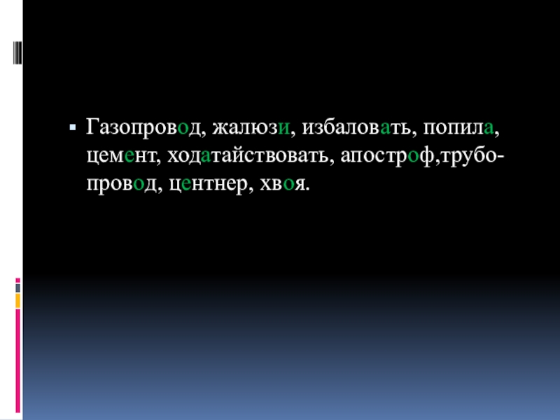 Слайд 9Газопровод, жалюзи, избаловать, попила, цемент, ходатайствовать, апостроф,трубо-провод, центнер, хвоя.
