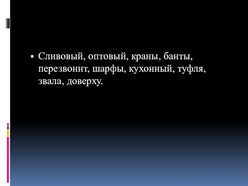 Слайд 14Сливовый, оптовый, краны, банты, перезвонит, шарфы, кухонный, туфля, звала, доверху.