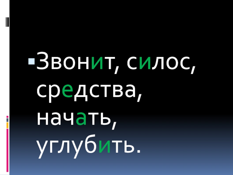 Слайд 5Звонит, силос, средства, начать, углубить.