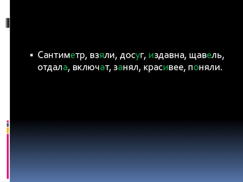 Слайд 2Сантиметр, взяли, досуг, издавна, щавель, отдала, включат, занял, красивее, поняли.