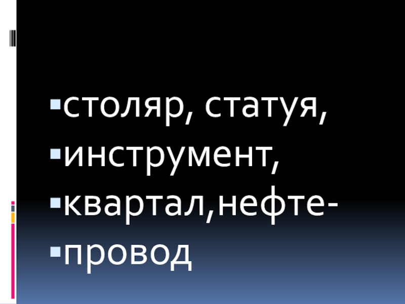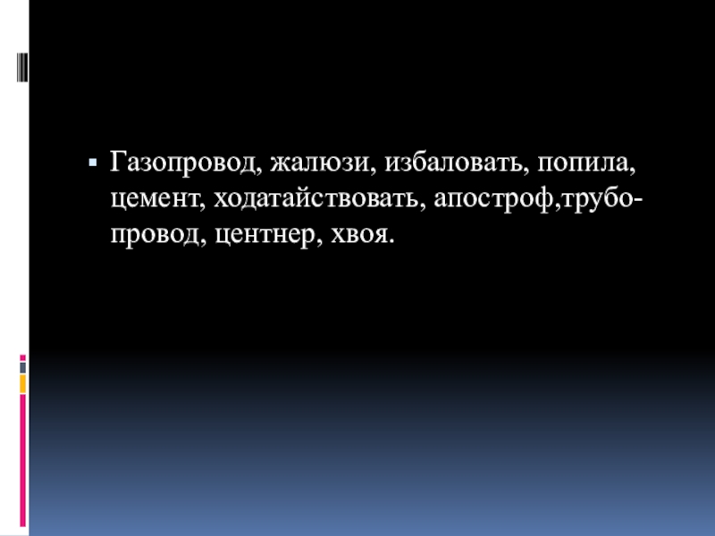 Слайд 8Газопровод, жалюзи, избаловать, попила, цемент, ходатайствовать, апостроф,трубо-провод, центнер, хвоя.