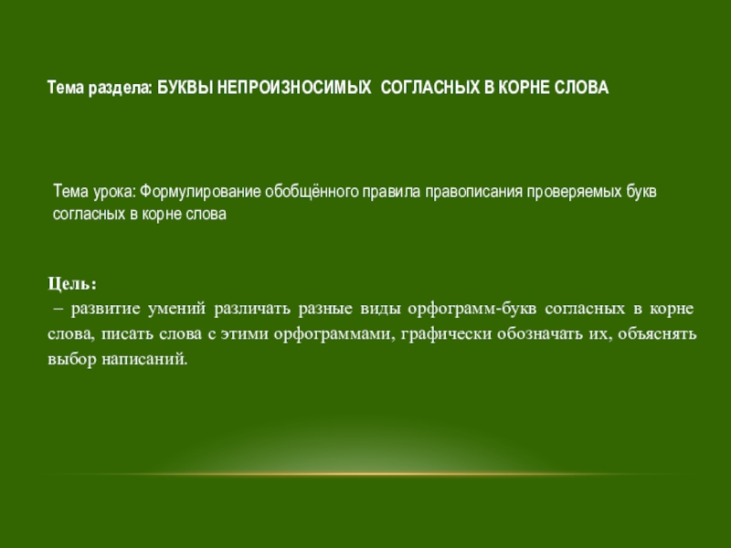 – развитие умений различать разные виды орфограмм-букв согласных в корне слова, писать слова с этими орфограммами, графически обозначать их, объяснять выбор написаний.