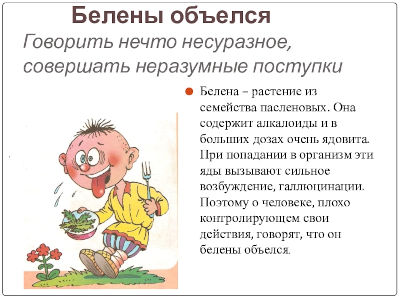 Белена – растение из семейства пасленовых. Она содержит алкалоиды и в больших дозах очень ядовита. При попадании в организм эти яды вызывают сильное возбуждение, галлюцинации. Поэтому о человеке, плохо контролирующем свои действия, говорят, что он белены объелся.