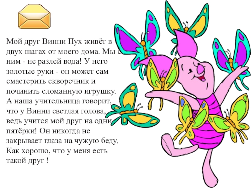 Мы с ним - не разлей вода! У него золотые руки - он может сам смастерить скворечник и починить сломанную игрушку. А наша учительница говорит, что у Винни светлая голова, ведь учится мой друг на одни пятёрки! Он никогда не закрывает глаза на чужую беду.