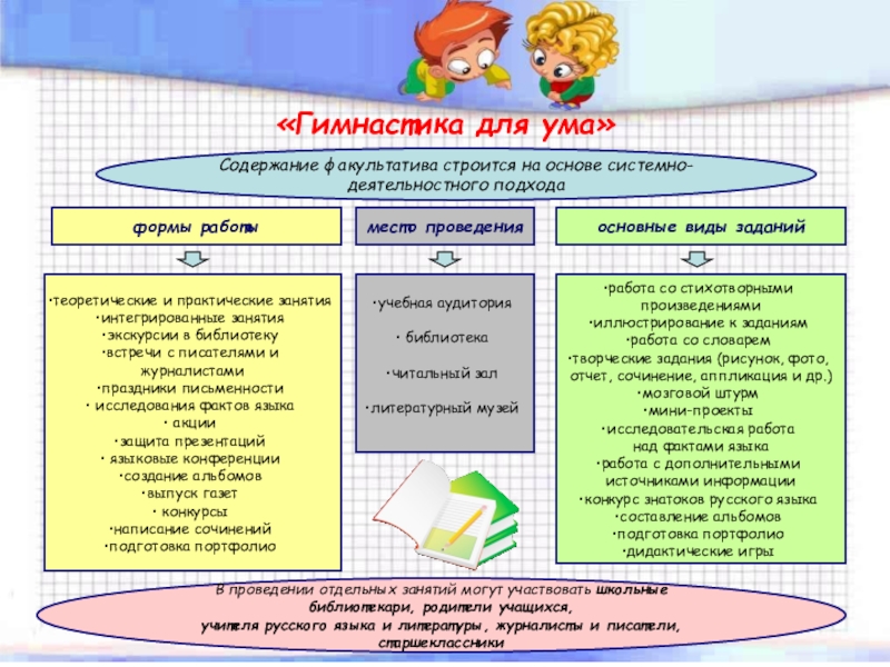 В проведении отдельных занятий могут участвовать школьные библиотекари, родители учащихся,