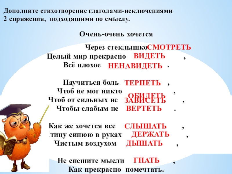Дополните стихотворение глаголами-исключениями 2 спряжения, подходящими по смыслу.