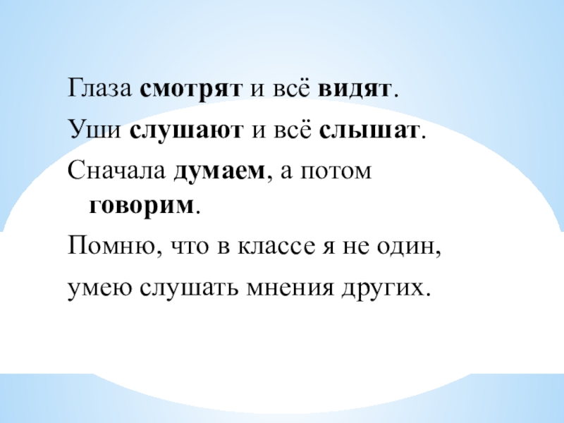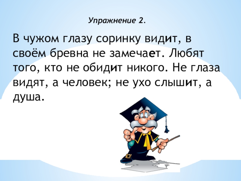 В чужом глазу соринку вид…т, в своём бревна не замеча…т. Люб…т того, кто не обид…т никого. Не глаза вид…т, а человек; не ухо слыш…т, а душа.