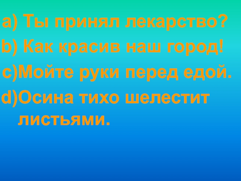 Ты принял лекарство? Как красив наш город!Мойте руки перед едой.Осина тихо шелестит листьями.