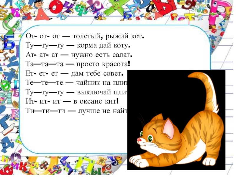 От- от- от — толстый, рыжий кот.Ту—ту—ту — корма дай коту.Ат- ат- ат — нужно есть салат.Та—та—та