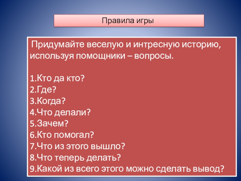 Придумайте веселую и интресную историю, используя помощники – вопросы.