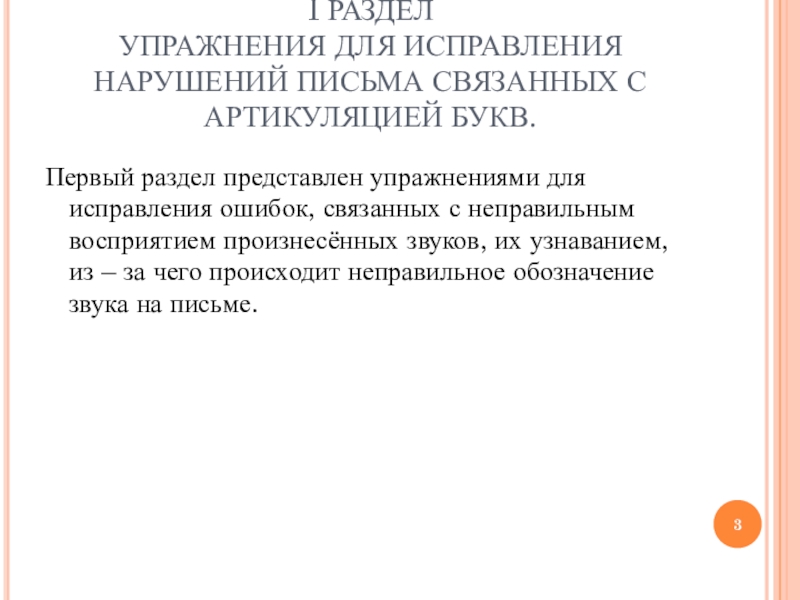 представлен упражнениями для исправления ошибок, связанных с неправильным восприятием произнесённых звуков, их узнаванием, из – за чего происходит неправильное обозначение звука на письме.