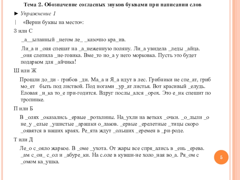Слайд 5Тема 2. Обозначение согласных звуков буквами при написании слов