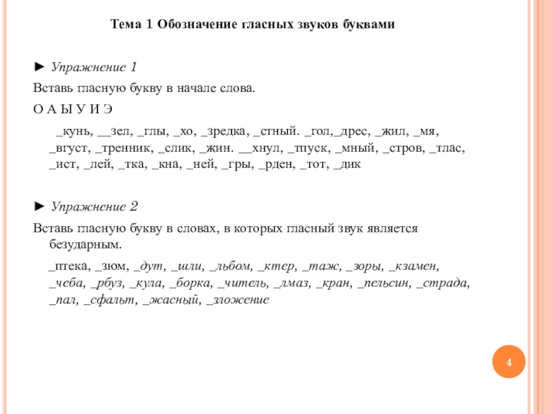 Слайд 4Тема 1 Обозначение гласных звуков буквами