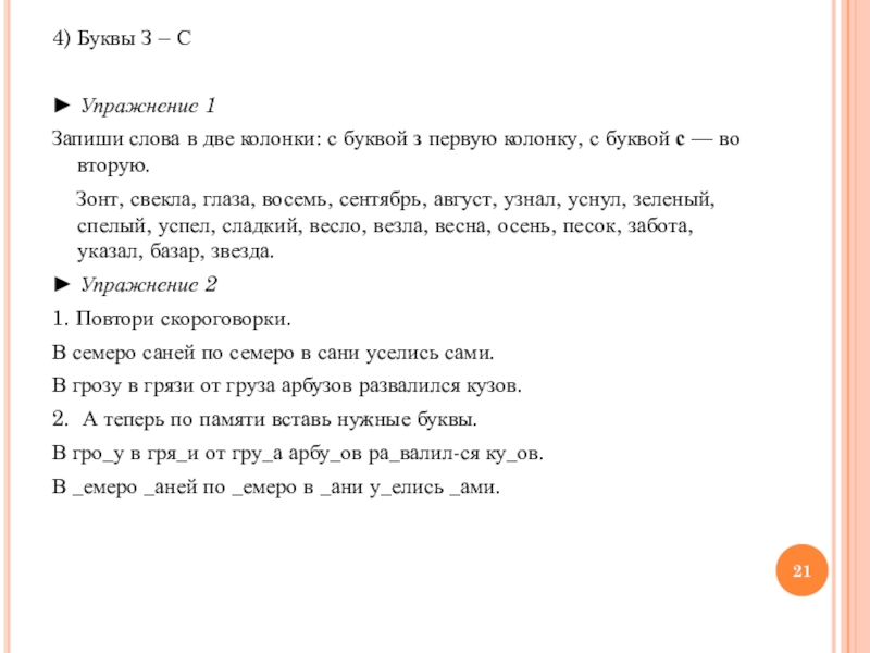 Зонт, свекла, глаза, восемь, сентябрь, август, узнал, уснул, зеленый, спелый, успел, сладкий, весло, везла, весна, осень, песок, забота, указал, базар, звезда.