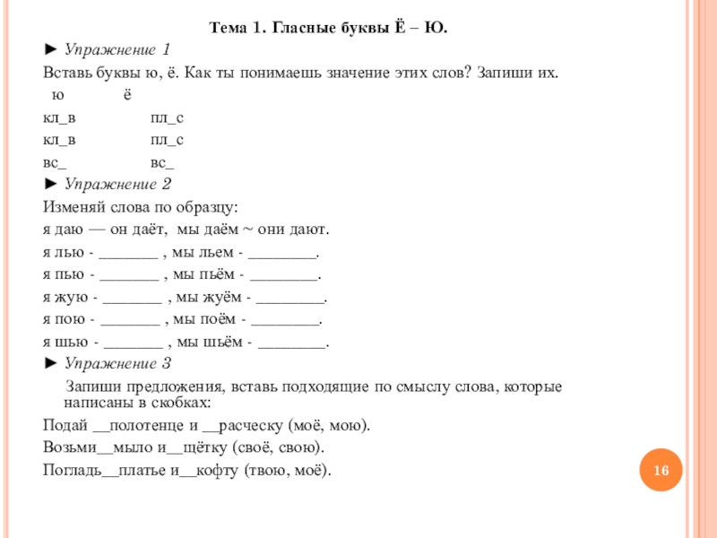 разделе упражнения позволят научиться различать сходные по произношению гласные, указывающие на твердость согласных звуков, и гласные, указывающие на мягкость согласных звуков.