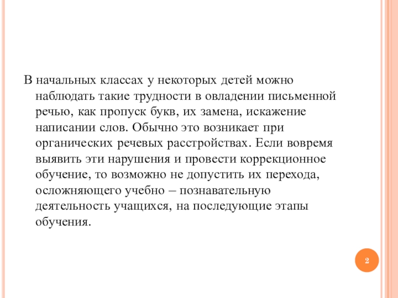 овладении письменной речью, как пропуск букв, их замена, искажение написании слов. Обычно это возникает при органических речевых расстройствах. Если вовремя выявить эти нарушения и провести коррекционное обучение, то возможно не допустить их перехода, осложняющего учебно – познавательную деятельность учащихся, на последующие этапы обучения.