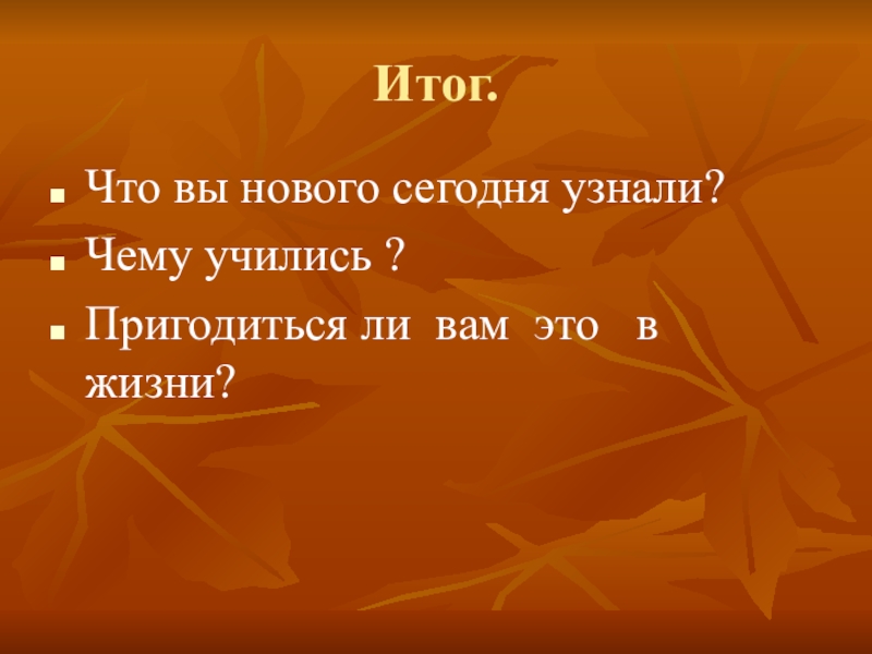 Итог.Что вы нового сегодня узнали?Чему учились ?Пригодиться ли вам это  в жизни?