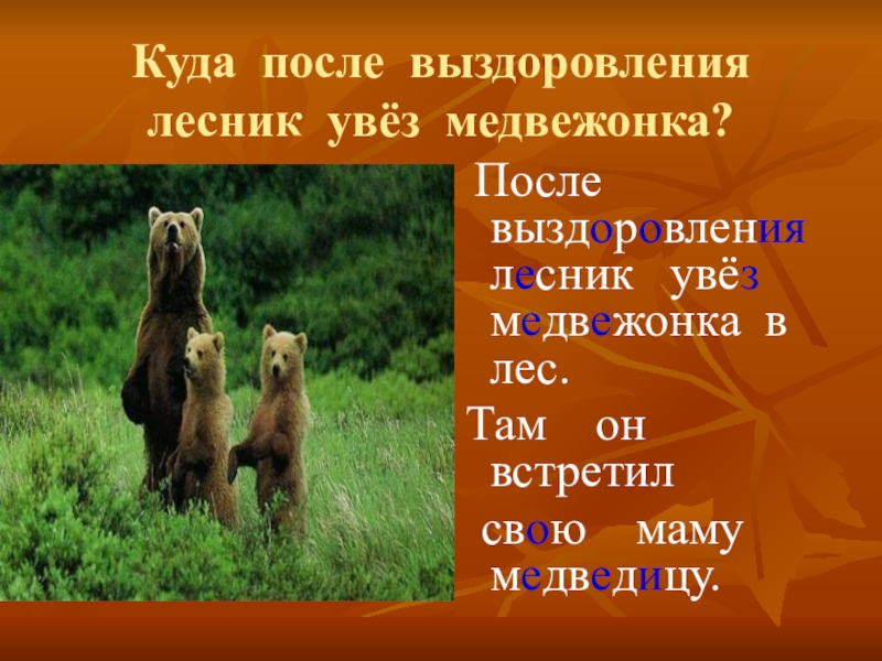 Слайд 7Куда после выздоровления лесник увёз медвежонка?