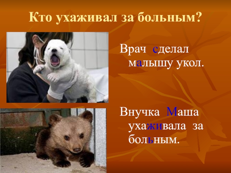 Кто ухаживал за больным?Врач сделал малышу укол.Внучка Маша ухаживала за больным.