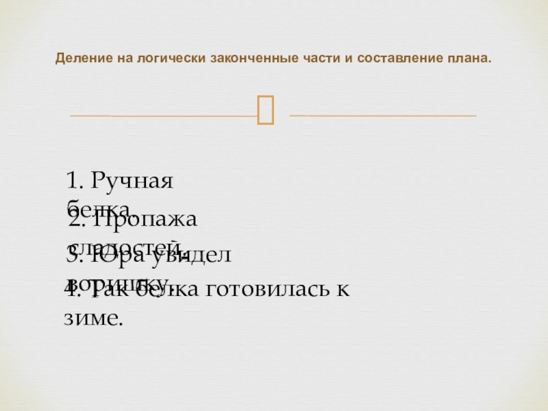 Деление на логически законченные части и составление плана. 1. Ручная белка.2. Пропажа сладостей.3. Юра увидел воришку.4. Так